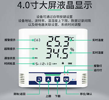 ·产品采用大屏液晶显示,具有温湿度上下限双重控制,自由设置限制,可以实现高低温度报警与高低湿度报警并实时显示。