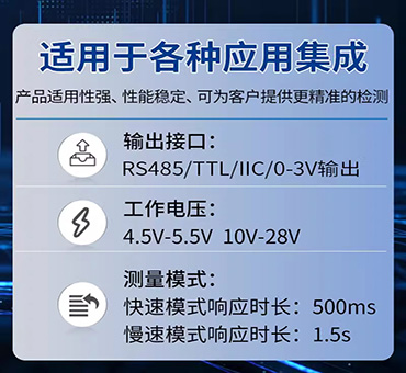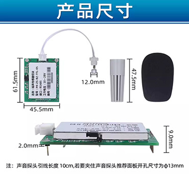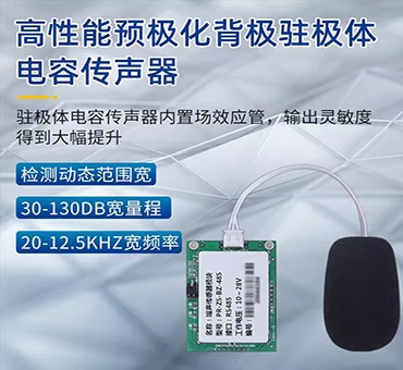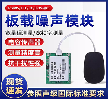 PCB板载安装方式,30~130dBA宽量程、20~12.5KHz宽频率测量,输出接口TTL或RS-485出厂可选,供电电源4.5V~5.5VDC、10~28VDC可选。