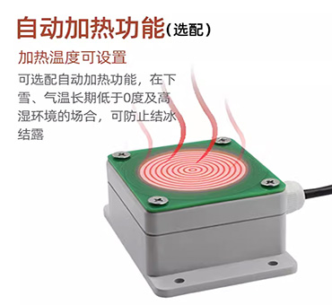 选配有加热功能,当检测到气温低时,自动启用下雪加热功能来加速去雪冰,使得测量的速率加快。
